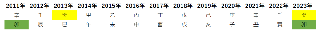 2011年以降の干支を表にしていますが、黄色と緑色の塗りつぶしで示したように、2011年は辛卯(かのとう)の年、2013年は癸巳(みずのとみ)の年というように、2011年は2023年と同じく卯の年、2013年は2023年と同じく癸の年となります。