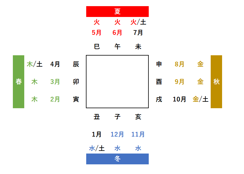 ただし1点だけ、丑の月と辰の月、つまり1月と4月はそれぞれ冬から春、春から夏の変わり目となる土用の期間を含むため、土のエネルギーも含む点に注意が必要となります。