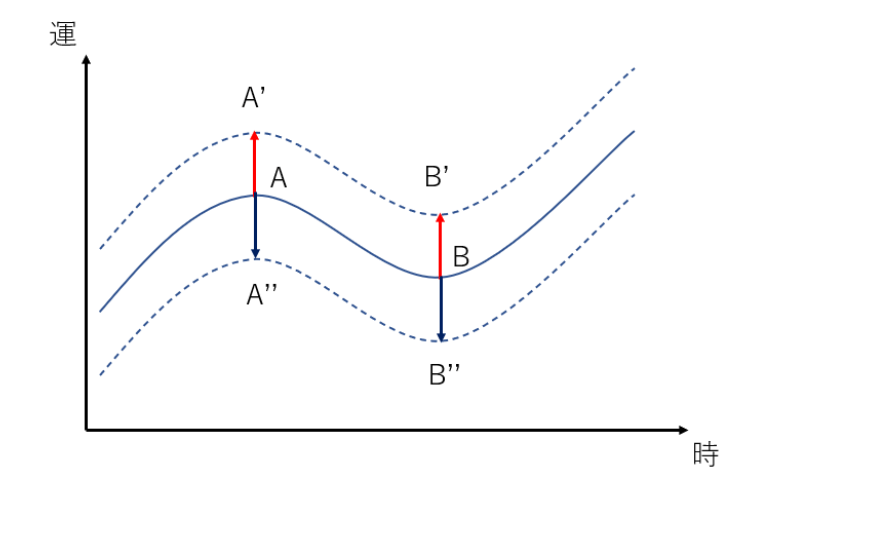この時、運としては上図のようなイメージで、元の運がAとBで表されますが、変動幅があって、Aは最大のA’から最小のA”まで、Bは最大のB’から最小のB”まで変動するイメージです。