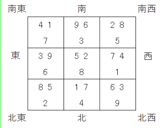 例えば1は吉数ですので、山の気を表す数字が1となる北方位は落ち着き、よく眠れる方位となります。