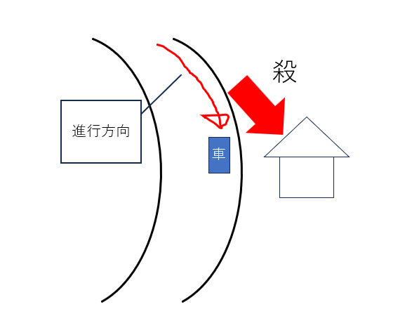多くの車は道路から飛び出すことなくカーブを曲がっていくと思いますが、曲がり切れずに直進する風が家にぶつかると思います。