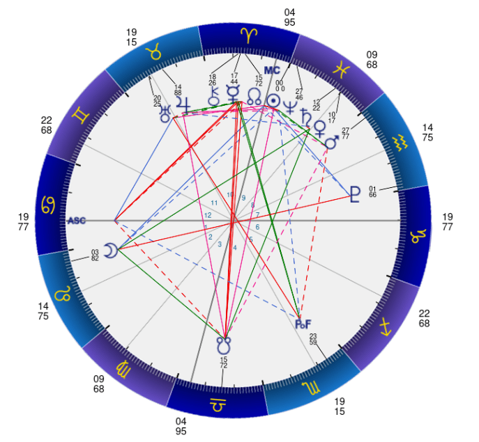 太陽☉は当然ながら牡羊座♈ですが魚座♓の海王星♆と0度コンジャンクションで接触、水瓶座♒の冥王星♇とも60度セクスタイルでエネルギーを受け取ります。