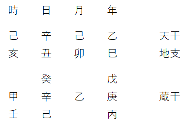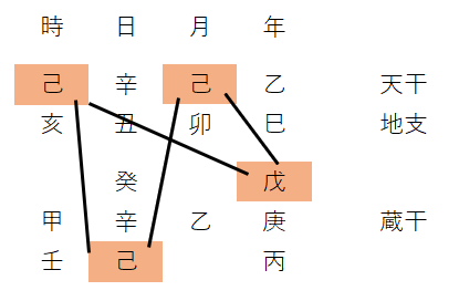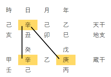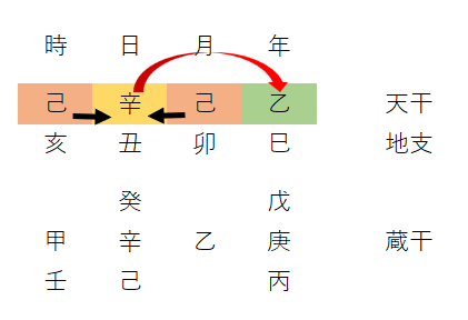 この己は日干の辛を挟み込むように、月と日の柱に位置しております。